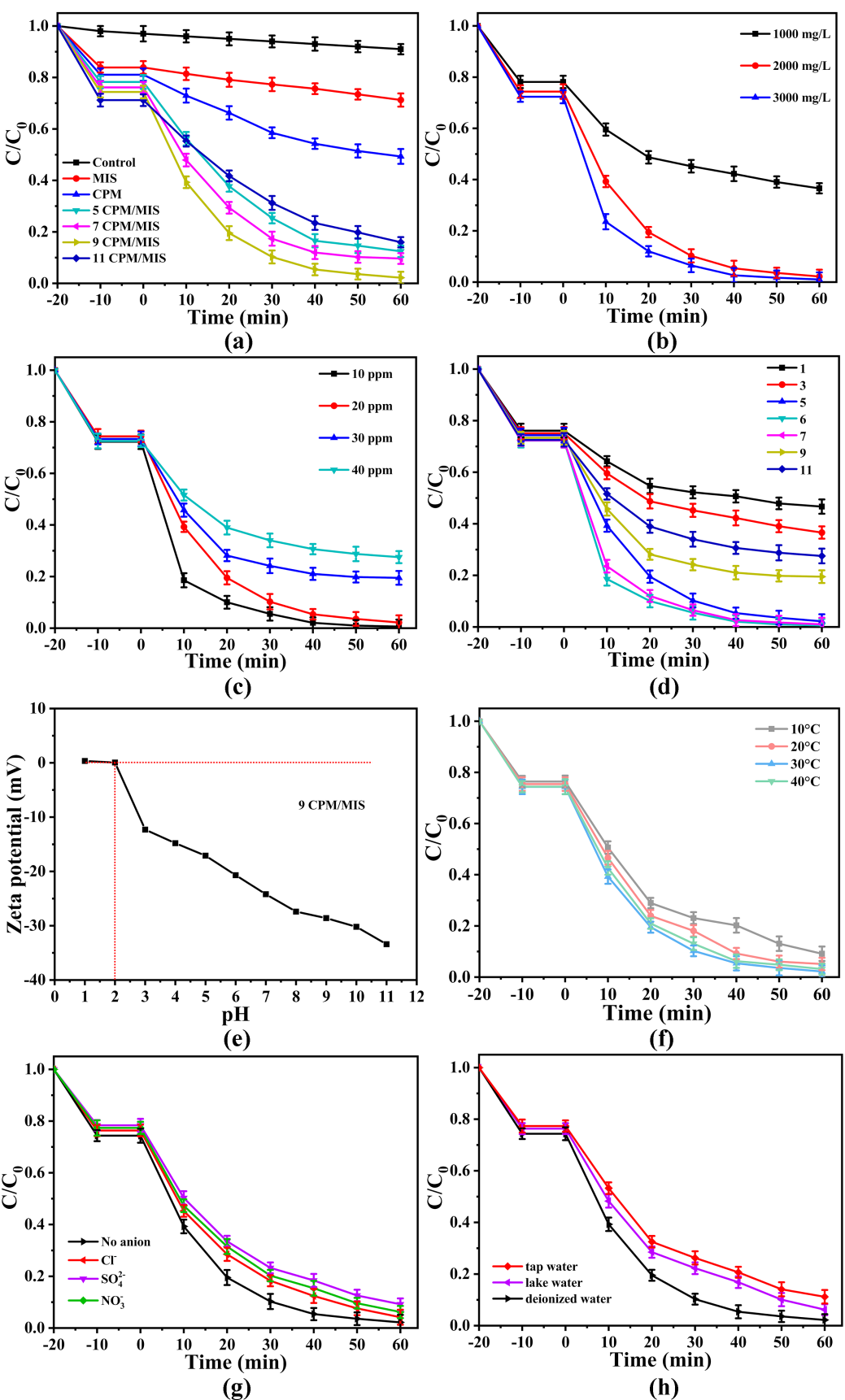 作者將制備的CPM/MIS復合材料應用于光催化降解TC中。結(jié)果表明其具有良好的可見光催化活性,相比之下,MIS和CPM之間形成異質(zhì)結(jié)催化劑,顯著增強了TC降解的催化性能。合成的CPM/MIS復合材料在處理制藥廢水方面具有很大的應用潛力。并考察了污染物濃度、催化劑用量、pH值、無機陰離子、反應溫度和水質(zhì)等參數(shù)對TC降解效率的影響。