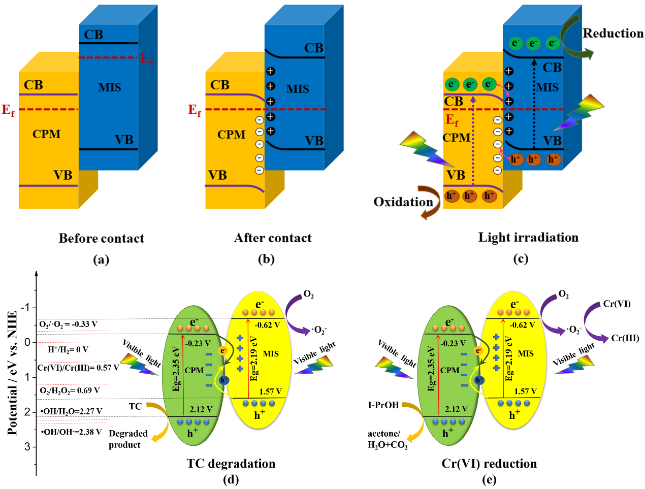S型異質(zhì)結(jié)中光生電子和空穴的分離和轉(zhuǎn)移機制。與MIS相比,接觸前CPM表現(xiàn)出較低的導帶(CB)、價帶(VB)和平衡費米(Ef)位置。當它們開始接觸時,電子表現(xiàn)出自發(fā)的從MIS向CPM遷移的趨勢,直到它們的費米能級達到平衡,由于電荷重排導致能帶彎曲。在光照下,CPM和MIS都可以被光激發(fā),產(chǎn)生電子并傳輸?shù)紺B,同時在VB上留下空穴。由于能帶彎曲和內(nèi)界電場的協(xié)同作用,MIS的VB上的空穴傾向于與CPM的CB上的電子重新結(jié)合,從而加速了催化劑體系中光致載流子的分離和轉(zhuǎn)移速率。
