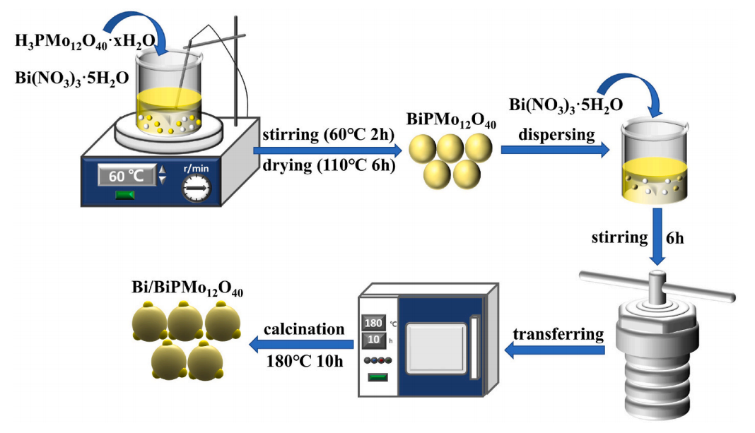 BiPMo12O40材料是通過常規合成方法制備的,然后經過水熱處理過程制得Bi/BiPMo12O40材料。首先,依次將Bi(NO3)3·5H2O和H3PMo12O40·xH2O加入去離子水中,60 ℃攪拌2 h,然后在110 ℃干燥6 h,得到BiPMo12O40材料。隨后,制備好的BiPMo12O40和不同量的Bi(NO3)3·5H2O分散到乙二醇中,乙二醇充當還原劑。經過超聲和攪拌6 h后,將混合物放入50 mL高壓釜中,在180 ℃下加熱10 h,制得Bi/BiPMo12O40材料。