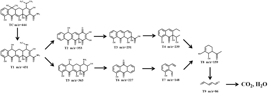 采用了高效液相色譜質譜聯用(HPLC-MS)技術來研究TC降解過程中的中間體。隨著反應的進行,最后,所有降解中間體都被氧化為小分子、CO2 和H2O。