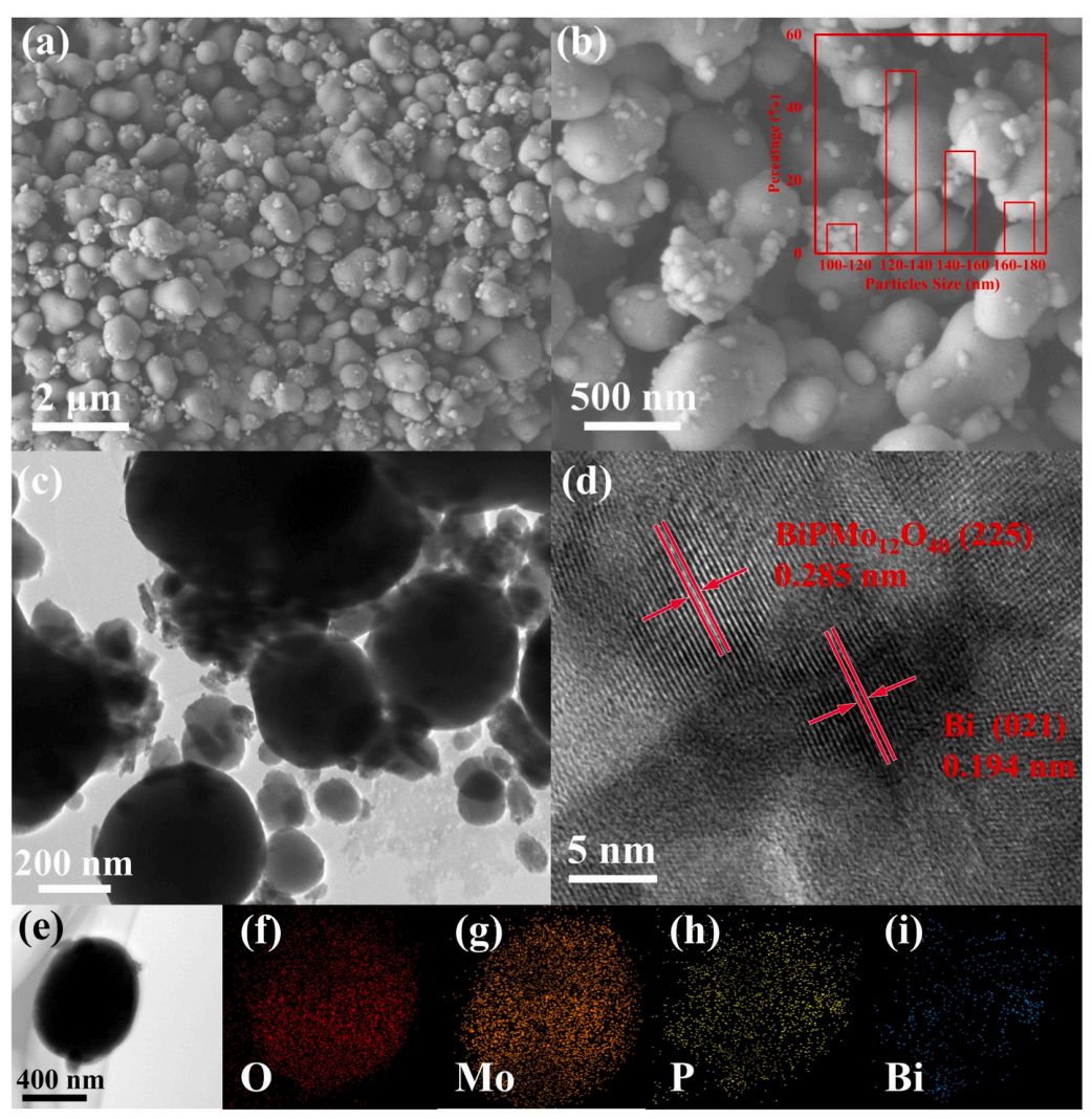 通過掃描電子顯微鏡、透射電子顯微鏡評估了所得樣品的形態和粒徑。這些Bi/BiPMo12O40樣品由BiPMo12O40納米球和Bi納米顆粒組成,Bi納米顆粒均勻分布在BiPMo12O40納米球表面。BiPMo12O40和Bi的尺寸范圍分別為500 ± 100 nm和140 ± 40 nm。并且發現了0.285 nm和0.194 nm的晶格間距,分別與BiPMo12O40的(225)面和Bi的(021)面一致,確認了這種復合材料中BiPMo12O40和Bi的共存。元素映射圖像用于驗證所得樣品的元素組成。清晰地觀察到Bi、P、Mo和O元素在1.0% Bi/BiPMo12O40樣品中均勻分散,進一步確認了成功構建了這種復合材料。